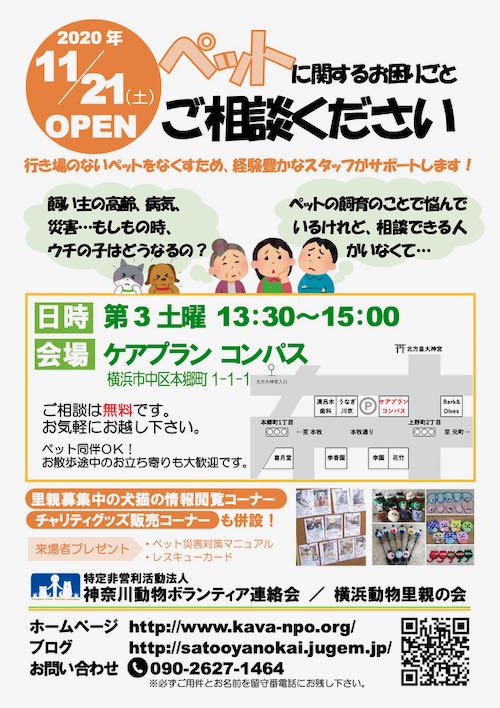 JUGEMテーマ:動物愛護 先週の 三連休 初日🍡 11月21日(土) 地元ヨコハマ 本牧通り商店街。 ちいさいけれど、 大きな いっぽを 歩み出しました✨ 🐶「ペットの相談会」😸 このココロミが 可能になったのは、 スペースを提供して下さった 「ケアプラン・コンパス」さんのおかげです✨ コンパスさんに、ほんとうに感謝です。 &...