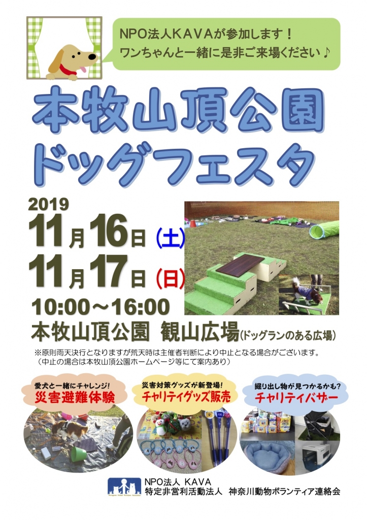JUGEMテーマ:動物愛護 今週末はドッグフェスタ🐶✨ 横浜市中区 本牧山頂公園デス。 お天気上々❗ 当会 NPO法人 KAVAは 「ペットの災害避難体験」をやります👍 ワンちゃんと遊びながら、 災害対策が、しっかり収集できますよ🙆♀ 猫ちゃんの災害対策も 情報収集 できますからね 😸✨ ぜひ、ブースに遊びに来て下さい。 お待ちしています🍀 入場料 無料(ドッグラン利用他一部コ...
