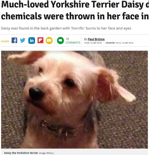 自宅庭で化学薬品を何者かに浴びせられたデイジー(画像は『Manchester Evening News 2018年9月14日付「Much-loved Yorkshire Terrier Daisy dies after chemicals were thrown in her face in garden」(Image: RSPCA)』のスクリーンショット) なぜ、この犬がターゲットにされなければならなかったのか。飼育放棄や暴行など動物虐待があとを絶たないイギリスで、またしても悲しいニュースが飛び込んできた。ある女性の飼っていた愛犬が、何者かに化学薬品を浴びせられ酷い火傷を負い、最終的に安楽死を余儀なくされたのである...