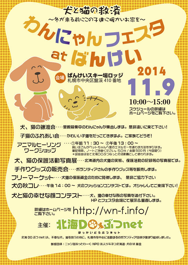 かわいい犬・猫たちがお家を探しています。 ペットショップへ行く前にどうか会いに来てください。 アニマルヒーリングセミナー 急遽開催することになりました。 11時半〜12時20分 13時〜13時50分 金額500円 当日お支払ください。 収益金は全て北海DOぶつnetの活動費として使われます。 JUGEMテーマ:動物愛護