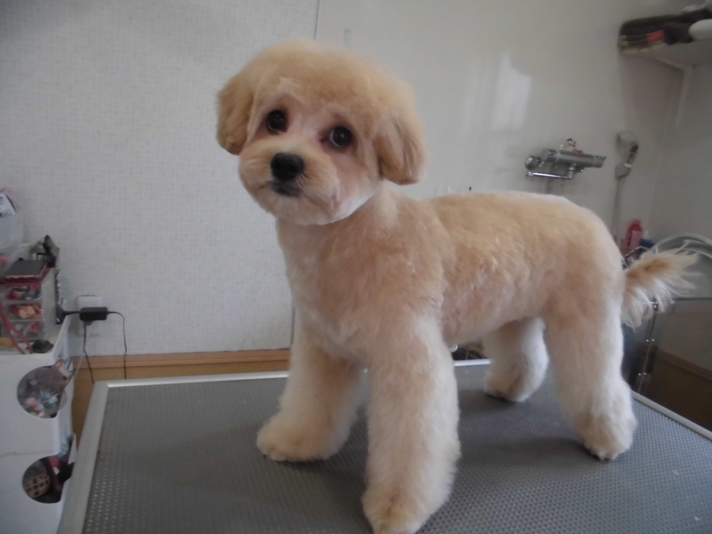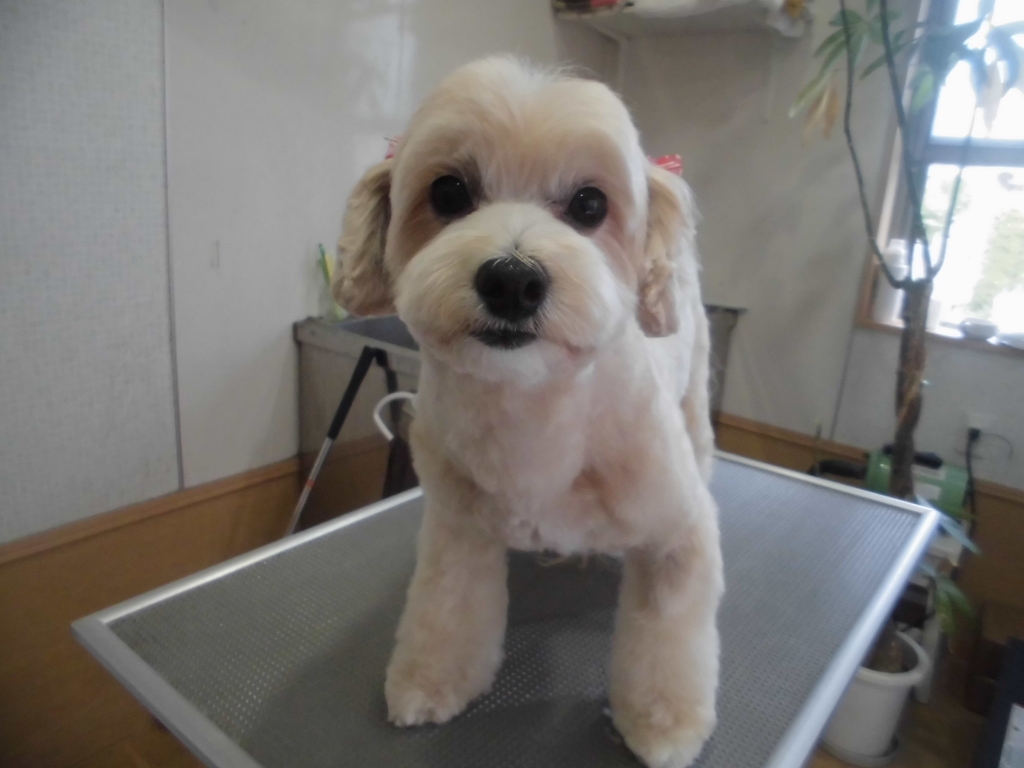 JUGEMテーマ:MIX犬 トイプードル×マルチーズのMIXのチャロちゃん。 リキくん&ジェロムくんのご紹介で来てくれました、ありがとうございます(^O^) 5ヶ月のあどけないお顔の可愛い女の子💗 頭は、耳とつなげてふんわり丸くして可愛くなったよ〜(*'ω'*) まだ、毛が柔らかくて短いので、もっと大きくなるように伸ばしていこうね! また次回、チャロちゃんの成長を楽しみにお待ちしています。