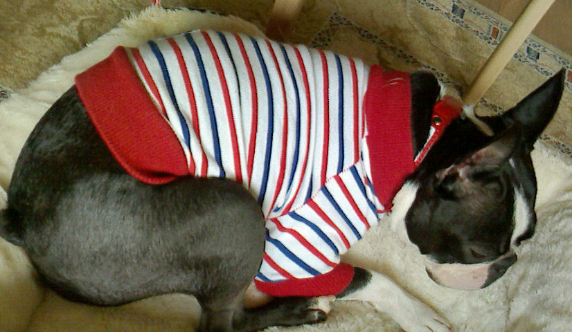 JUGEMテーマ:ボストンテリア ボストンテリアのメイちゃん(いや、メイ君かな〜) お顔が可愛いので勝手にちゃん付け ちょっとアンニュイな雰囲気のメイちゃん 重ね着もしてくださってありがとう〜可愛いですね〜 もしかして女子で必要あれば、女の子用に前丈を長めにお作りすることも可能です。 夏は良いけれど、冬は長いほうが暖かいかもしれません。 そんな時は備考欄にご記入いただくか、性別に女の子とお入れくださいませ。 ない場合や♂のご記入の場合は自動的に男の子用に前を短くお作りします。 (男の子は...