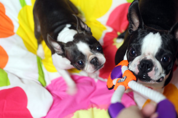 JUGEMテーマ:ボストンテリア引っ張りっこして遊んで欲しくて新しいおもちゃ投入。ろこのイキオイがすご過ぎてアールは手が出せない。おもちゃ頂戴!早く!早く!ろこは何よりもおもちゃを愛しております。なんとか引っ張りっこが開始されました。アールの方が体重的にも力的にも断然有利。でも、すぐに奪われる。ろこは自分よりも大きいおもちゃに大興奮。アールは『僕は遊ばせてもらえないんです...』と、目で訴えて来る。ガジガジ、と、悪い顔して齧る。すぐ壊れる。やっとの思いでおもちゃを奪ったアール。命がけ。ちょっとアール...