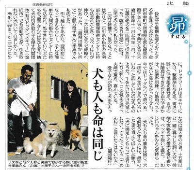 JUGEMテーマ:保護犬 先日、地元紙に老犬2頭が取材されて12/9の朝刊で記事になりました。Qべぇとリズが我が家に来たころは一年なんて考えてもいませんでしたが、こんなに元気でまた新年を迎えられそうです。なんたってうちにきた当時は立つこともやっとだったんですから・・今じゃ他のみんなと散歩に行ったりドライブに出かけたりもできます。今度のお正月は奈良まで行く予定です。