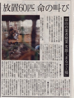 JUGEMテーマ:保護犬 前回のアップロードは我が家の記事でしたが、この記事は富山の繁殖業者についての記事です。 -北陸中日新聞 11/29 夕刊 - まだ記憶に新しい栃木での大量犬死骸放置につながるような悲惨な状態のレポートになっています。そこから(富山)の保護犬のうちの一頭で我が家にて預かりの「マリア」の写真もアップします。里親募集中ですのでよろしくお願いいたします。画像をクリックで拡大画像をクリックで拡大キャバリアのメスです。体は小さくて目がくりくりで顔も可愛らしいです。推定10歳で、この犬種...