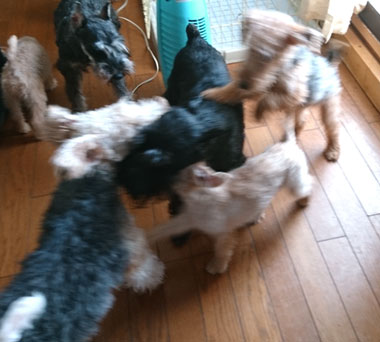 相模原から交配のために連れてきたミニチュアシュナウザーのブラックの男の子はすっかりうちに慣れましたw。 でも、明日のお昼に中央高速に乗って送って行きます。 最近、僕の後ろをストーカーのように付いてくるのですが、そのあとをレイキーの子犬たちが付いてくるので「白い巨塔」の院長の回診のような状態です。 レイキーの子犬達と1歳になるミニシュナがブラックのお兄ちゃんを大好きみたいです💛 JUGEMテーマ:ミニチュアシュナウザー