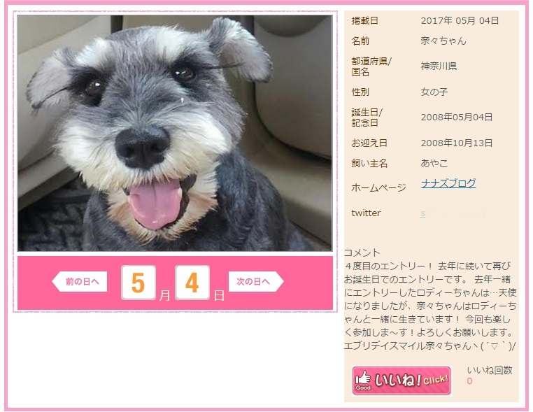 JUGEMテーマ:ミニチュアシュナウザー 奈々ちゃん 365CALENDAR http://www.365calendar.net/index?action=user_calendar_detail&calendar_id=951&target=20170504 昨夜、エントリーした奈々ちゃんが無事にエントリーできました! あとはしっかり365シュナが集まれば発行が決定になります。 楽しみで〜す!ちなみにお気づきかと思いますが…目の下の白い物…の正体は…。 また後日(笑) ではでは〜!