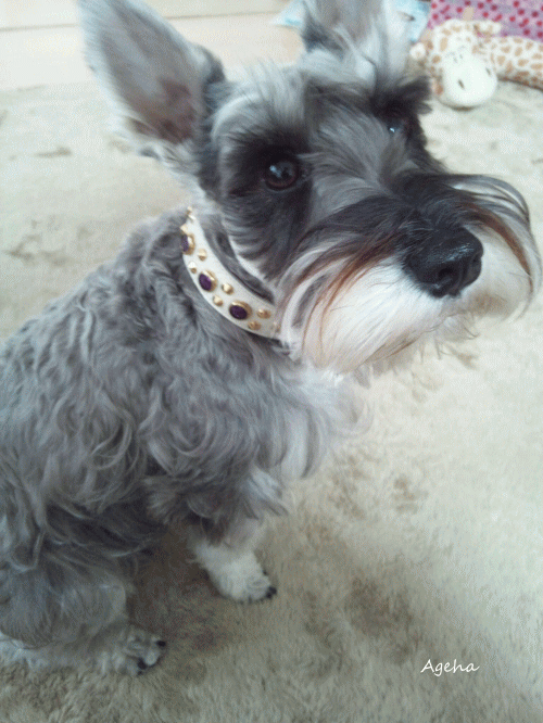 JUGEMテーマ:ミニチュアシュナウザー 可愛いお写真を頂いています! 4月に頂いていたのに、ブログにUPするのが 遅くなって申し訳ございません。 ご紹介させて頂きますね! M.シュナのあげはちゃんです! おめめがクリクリ♪ まつ毛がバサバサ♪ 可愛いあげはちゃんです♪ 「あげは」お名前がイメージにぴったり! アゲハ蝶のあげはちゃんでしょうか? 白ワニのT-DROPのストーンをIBUKIのストーンに変更して、 ゴージャスにゴールドスタッズで仕上げました。 とってもよくお似合いです!! パープルストーン...