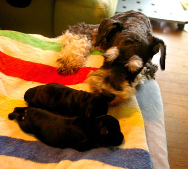 2回交配して妊娠しなかったため、久々にミニチュアシュナウザーの出産となりました。 2頭目までは比較的順調でしたが、3頭目が難産で亡くなってしまいました。 カンヌとブルーノの子で、男の子はBSに近いSPで、女の子はBSかな?って感じです。 カンヌと男の子1頭、女の子1頭の赤ちゃん JUGEMテーマ:ミニチュアシュナウザー