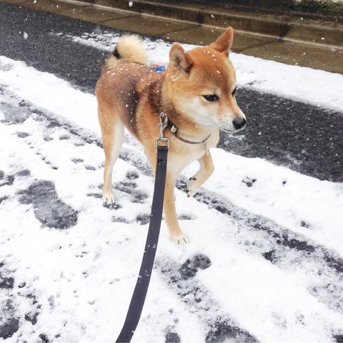 東京は今朝も雪が舞う天気でした。 トイレだけでもと散歩に出てみたけれど 冷たいのがイヤなのか? 片脚を上げて固まってました…。 ペット わんこ 柴犬