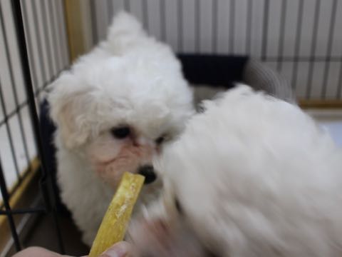 ビションフリーゼのこいぬ兄妹に《 七面鳥すじ 》をあげてみました。 生まれて初めてのおやつ。 生後約65日。 お店に連れて来て2日目。 「早くない?」「いいの?」と、思われる方もいらっしゃるかもしれません。 「いいんです!」(カビラ調) 歯や顎を使ってしっかり噛む力があるし、消化に問題も無い。 心身共に丈夫で適応能力のとても優れた仔たちなので、どんどん新しい刺激を与えていこうと判断しました。 かみかみはみゅはみゅ。 かみかみはみゅはみゅ。 《 ビションフリーゼ 》 お誕生日:20...