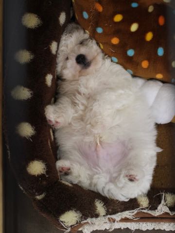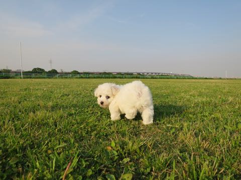 こいぬちゃん、被毛がもこもこしてておしりが大きく見える。 おむつしてるみたい。 その愛らしい姿から「むーにー」と呼んでいます。 moony (意味)夢心地の、ぼんやりした だそうです。 こいぬの感じから意味もなんとなく合ってる気がします。 どうぞよろしく。 《 ビションフリーゼ 》 お誕生日:2018年3月 性別 :おとこのこ カラー:ホワイト 血統:父犬AMチャンピオン ビションフリーゼのこいぬを家族として迎えたいとお想いの方からのご連絡を心よりお待ちしております。 フントヒュッテ Tel:03-...