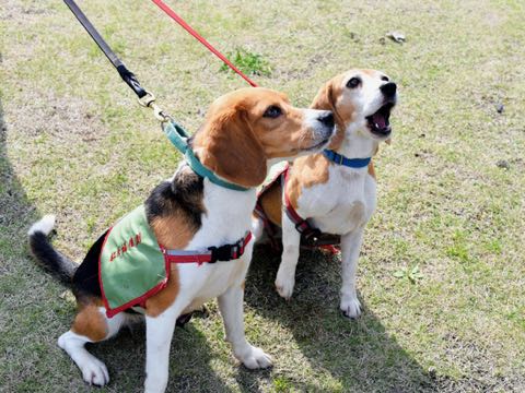 来日した2頭のヒアリ探索犬=鹿児島市の鹿児島大 外来種のヒアリを見つけて駆除につなげる「ヒアリ探索犬」によるデモンストレーションが26日、鹿児島市で開催中の日本応用動物昆虫学会にあわせて行われた。台湾の空港や建設現場などで活躍している2頭で、いずれも4歳のメスのビーグル。かすかなにおいを手がかりに、ヒアリの巣を探し出す。 台湾では2003年にヒアリが見つかった。その後一気に生息域が広がったが、探索犬の導入が奏功し、台北市と桃園市の空港内にいたヒアリは、約3年でほぼ駆除することができ...