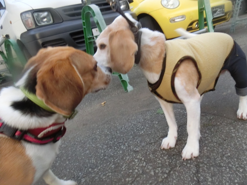 JUGEMテーマ:ビーグル JUGEMテーマ:ペット JUGEMテーマ:ビーグル 信号を渡ると「ナツがまだ来ていないから待つ!」と座り込み お散歩道に入っても強烈に抵抗 このニ三日ナツのお家のそばから一緒に歩いていたせいか 強情を張ってました そんなところにくみちゃんが現れました! 笑われてるかもよ ろびん! 今朝のくみちゃんファッション! 新作のお洋服 お母さん...