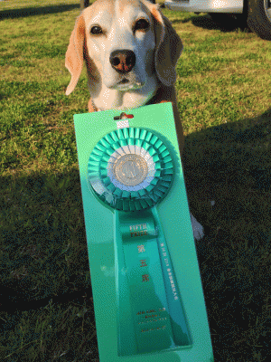 ルーはCD?(高等科)に3度目の挑戦。結論から書きますと、またポイントは獲れませんでした。失敗です。お点は177.5点頂きましたがこれはちょっと、頂き過ぎという印象です。何といっても私が最も力を入れて修正した「匂い嗅ぎ」が随所に表れてしまい、全体的な印象がとても悪かったと感じました。気温高く芝生のリンクで匂いが強く漂うという、真冬に比べてビーグルには厳しい条件とはいえ、全くもってお恥ずかしい状態を披露してしまいました。大きな失敗は「休止」で伏せを命じて私が隠れたとたんにすくっと立ち上がりそのまま「立止...
