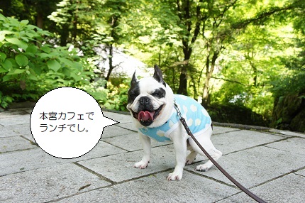 JUGEMテーマ:フレンチブルドッグ 日曜日、日光に行って来ました〜。 目的は東照宮近くの「本宮カフェ」でのランチwithこびさん。 新緑がきれい♪涼しい♪ スリッパに履き替えるので、テラス席へはこびんを抱えて。 木の間から神橋がチラリと見えて、中々良いロケーション。 よくテレビに出るクラムチャウダーは、かなりのボリューム。 生...
