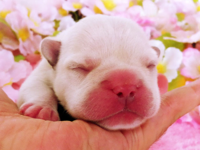 JUGEMテーマ:フレンチブルドッグ N犬舎のホームページに載っていた、生まれたばかりのモグちゃんの写真です。 生後間もない、フレンチブルの赤ちゃん。 これが生まれたばかりのモグちゃんです。 鼻やお口の周りが赤くなっています。ワンちゃんも生まれたときは赤ら顔なんですね! よく見ると手っこも赤くなっています。耳もちっちゃくてかわいいですね。 お目もまだ開いていません。毛も、産毛の感じでふわふわそうです。 丈夫に生まれてきて幸せそうです。これからどんな...