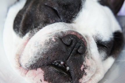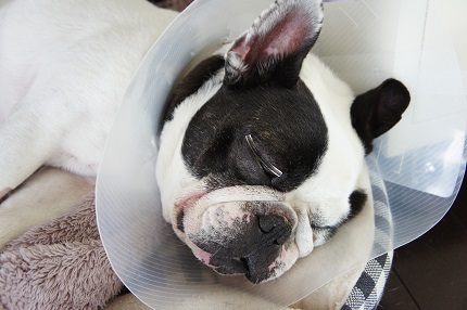 JUGEMテーマ:フレンチブルドッグ 昨日、無事に手術(ダイヤモンドバー角膜表層切除+瞬膜フラップ) を終えたこびさん。 昨日は絶食だったので、今日は朝ごはんを食べたら、 速攻で幸せそうに寝ちゃいました〜。 瞼の上に、チューブを半分に割いたものが縫い付けてある! きっとこれで瞼が開かないように固定してるんだと思う。 (お迎えはぶちょこ父が行ったので、そこんとこ聞いて来ず・・・) そういえば、前にブログか何かで同じようにボタンを縫い付けてる BUH...