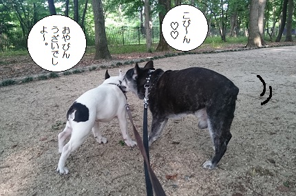 JUGEMテーマ:フレンチブルドッグ この間の土曜日は、またまた片道1時間かけて こびんの診察に行ってきました〜。 瞬膜で目玉を覆って、独眼竜こびんになって1週間。 診察は見ただけ、「いいですね。大丈夫そうですね〜。」で終了。 順調そうなので、まっいっか・・・。 次は2週間後に抜糸します。 エリカラ付けたアンテナ君生活も長く、もう5週間近くになるので、 たまにはアンテナ外して公園お散歩。 ぶちょうは最近、お散歩が嬉しくてテンション上がっ...