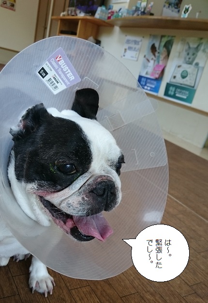 JUGEMテーマ:フレンチブルドッグ こびんの右目、眼球全体を瞬膜で覆っていたのに・・・ あれ?なんか眼球見えてきてる〜! というわけで病院に電話してみると、急遽診察に行くことになり、 「こうなったら抜糸しちゃった方がいいでしょう!」と、 土曜日、1週間早い抜糸となりました。 抜糸後の緊張から解放されたこびん。↓ 抜糸は麻酔無しでささっと済み、傷もきれいに治ってました〜。 念のため、もうしばらくアンテナ君生活。 お伴のぶちょうと...