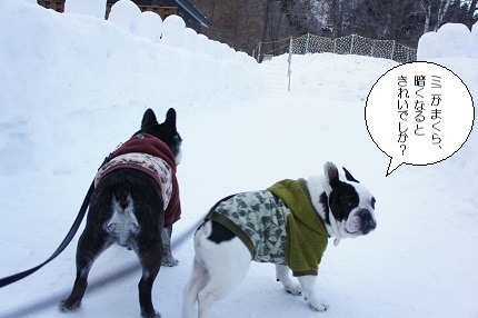 JUGEMテーマ:フレンチブルドッグ この間の土曜日、奥日光「湯の湖湖畔花火大会」を見に行ってきました〜。 明るいうちに着いたので、BUHIたちと雪まつり会場を偵察に。 たくさんのミニかまくらが道の両側に並んでます。 中に入れるかまくらがあったので、入ってみました〜。 全日本氷彫刻大会で、立派な彫刻がかまくらの中に展示してありました〜。 ...