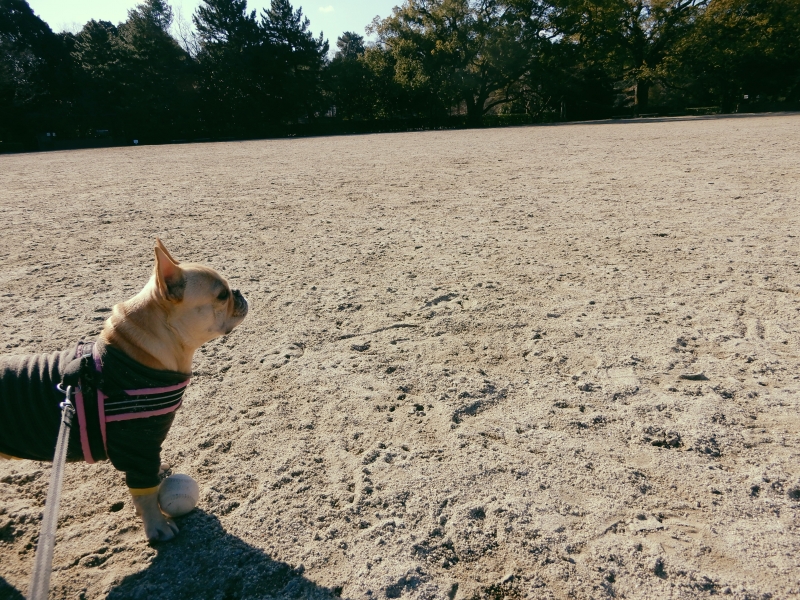 JUGEMテーマ:フレンチブルドッグ 京都御苑内の、広いグラウンド。 忘れ物の野球のボールを見つけて、大喜びのハンちゃん。 ん。 。。 そして、不意打ちのごろーん! ごろん。 ごろん。 ひろーくて、平らなグラウンドの真ん中で。 気分がいい!らしいのはわかるけど。。 めちゃくちゃ、砂がついてますやん; そして、また。。 ごろん。 ごろん! ごろん。 セ...