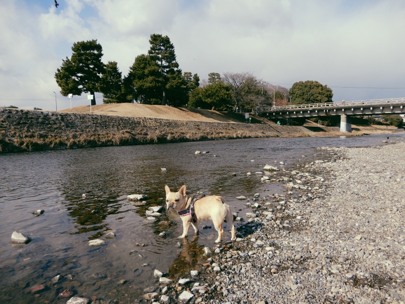 JUGEMテーマ:フレンチブルドッグ 京都・出町柳の中洲で遊んでいます。 今日の京都市内は、いいお天気でした。 ハンちゃんはご機嫌さんで、早速のごろん。 中洲の砂利の上でのごろん。は、ツボ押し効果がありそうですねww この日もたくさん歩いてきたので、暑かったのかな? 川にも入って遊びましたよ。 いつもは人がたくさんで賑やかな出町の中洲も、午前中は人もまばらです。 のんびり中洲を楽しむハンちゃん。 。。かと思えば、枝を見つけて走ってき...
