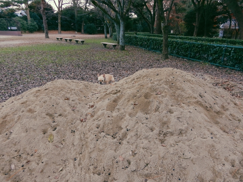 JUGEMテーマ:フレンチブルドッグ 小さな砂山を登る。 ハンちゃん、何か食べてる? 砂山のそばには大きな椋の木があって、、、やっぱり! 落ちている椋の木の実を熱心に探して食べていました。 ハンちゃんに教えてもらうまで、京都の市街地にこれだけたくさん椋の木が植えられていることに気がつきませんでしたが、 熟した椋の木の実は、秋の初めから今の時期くらいまで京都市内のあちこちに落ちています。 ハンち...