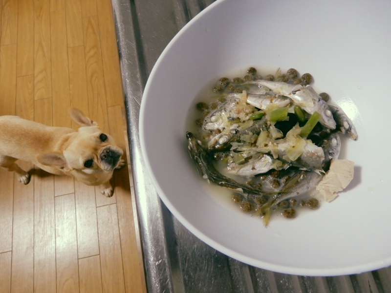 JUGEMテーマ:フレンチブルドッグ 今日のハンナごはん=小アジと鶏肉・モロッコエンドウ・キャベツ・黒豆のクリーム煮 小アジは新鮮なものなので、骨や内臓ごと食べられます。 ハンナには5歳までずっと手づくり食をあげていましたが、6歳よりドッグフードと手づくりスープを混ぜてあげています。 健康診断や血液検査でも数値に問題はありませんでしたが、今は各項目の数値が理想的になり、体も引き締まりました。 季節の変わり目には、いつも膀胱炎や下痢になりが...