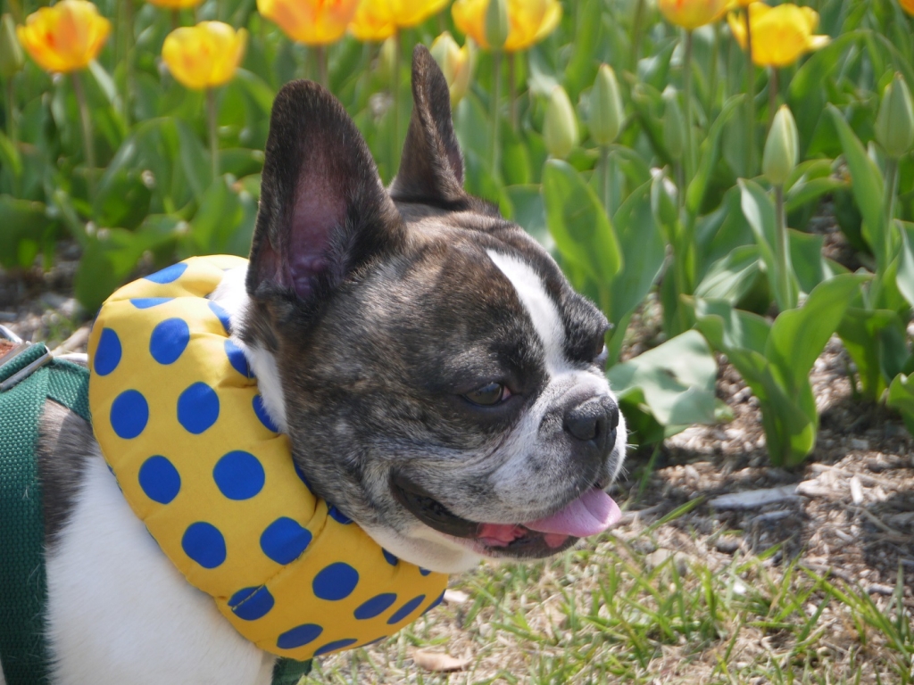 JUGEMテーマ:フレンチブルドッグ さわやかな日曜の朝だったので クリちゃんと民俗公園へ行ってきました。 八重桜が満開の菖蒲園で。 思った通り里桜の並木も満開。 お天気は最高、風も心地よくて幸せな気分で歩けました。 新緑と桜を映した池とクリちゃん。 チューリップがお顔に被ったのがなぁ・・・。 クリちゃん、どこにいる? この公園には何軒か...