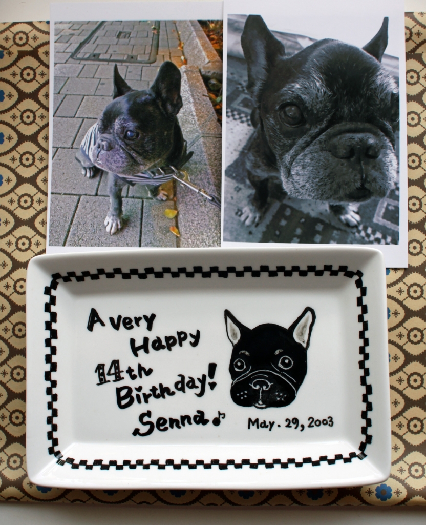 JUGEMテーマ:フレンチブルドッグ ふれん フレンチブルドッグのsenna(セナ)君のお誕生日プレート セナ君は来月5月29日に14歳になるそうです すばらしいですね お写真を拝見して描かせて頂きました。 14歳の彩りの一部になれますように 本当におめでとう!ありがとうございます
