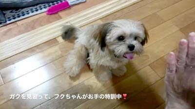JUGEMテーマ:しつけ ランキングに参加しています!ぽちっといいねお願いします。 ヨーチワのフクがお手の特訓中です。 ガクを師匠に見よう見まねで 頑張っています。 でもでも、その師匠のガクが 時々侵略してきて、集中できません。 挙げ句の果てに、手をあげたまま フライング気味にまっています。 なんとか雑ですが、少しは形になってきました。 どこまで極めれるかこれからの楽しみです。 しかし、フクち...