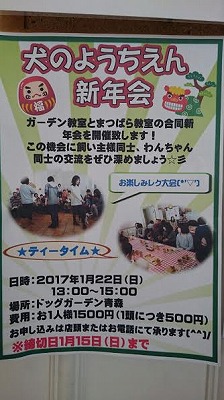 JUGEMテーマ:しつけ みなさんお待たせいたしました! 犬のようちえん新年会の開催お知らせです(^^) 内容は ゲーム大会に軽食タイム、交流会など盛りだくさん☆ すでに、続々とお申し込みいただいておりますよ(*^-^*) お申込みお問い合わせは店頭、ようちえんスタッフ または、017−718−2878(ドッグガーデン青森) まで! たくさんのようちえんせいと、そのご家族のご参加を お待ちしております(*^^...