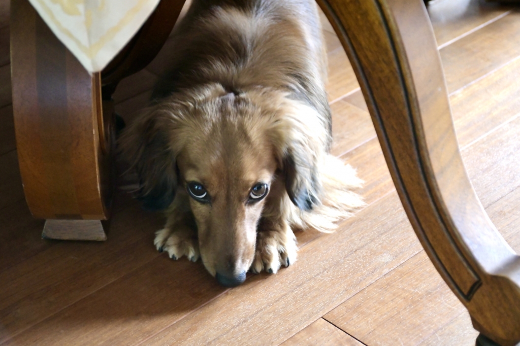JUGEMテーマ:いぬのきもち 都合が悪くなったり、悪戯をして叱られそうになると急いでリビングテーブルの下へ潜り込みます。 ここだと簡単には捕まらないのです。 パパの手が伸びてきたらこのままバック、バックでかわします。 ママには「悪賢いのはジャスティスのうえかもね。」と言われています。