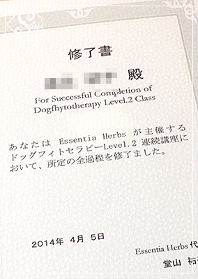 先日、修了したハーブ講座。 修了証が届きました。 …そう、修了証。 この講座は認定講座なので、基準を満たしていればアドバイザー認定がもらえるのだけど、受講中にカウンセリングセッションの課題を提出できなかったので、認定証にはなりませんでした^^; 以前にも記事にしたことがあって、その時はご協力いただける方が見つからずにできなかったカウンセリングセッション。 改めて、協力してくださる飼い主さんとわんちゃんと募集したいと思います。 ハーブは(アロマもだけど)薬のように、飲...