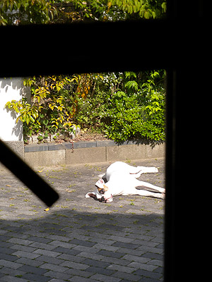 最近、ベッカムおじさんの体調が悪く、相手にしてもらえないポパはストレス気味。「遊べー!パソコンばかり見るなー!俺を見ろー!」そんな気分なんだろうか、仕事中に飛びつきあま噛み大王が現れる。相手してあげれないから、玄関を開けて庭へ解放〜。箒を振り回し遊んだ後、静かになった…小窓から覗くと、行き倒れの白く光る犬。日光浴ね。今日は太陽の光が強くて、真っ白に光るポパの身体。寝てるかと思ったら赤目半開きやった。JUGEMテーマ:愛犬との日々