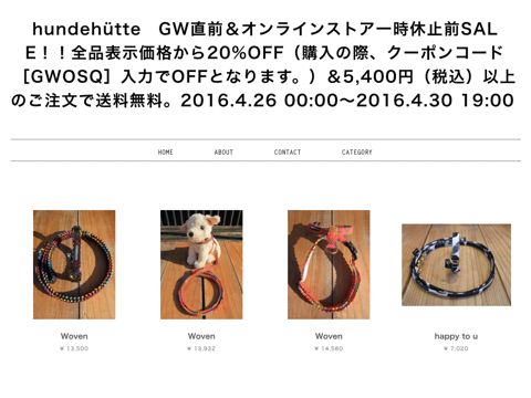 GW直前&オンラインストア一時休止前SALE、本日最終日となります!! 全品表示価格から20%OFF(購入の際、クーポンコード[GWOSQ]入力でOFFとなります。) & 5,400円(税込)以上のご注文で送料無料!! この機会に是非ご利用ください!! 本日をもってオンラインストアを一時休止致しますので、気になった商品ございましたら是非是非!! 商品お問い合わせ Tel:03-6380-7820(フントヒュッテ) ONLINE STORE:http://www.shop.hundehutte.net/