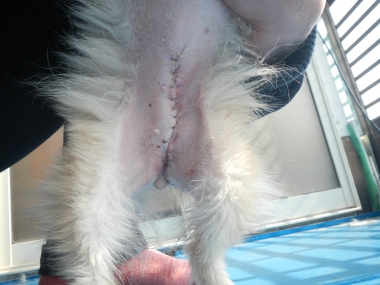 JUGEMテーマ:愛犬のいる暮らし 皆さんこんにちゎ! さ〜明日は待ちに待った抜糸の日です! 長かったな〜〜! しかし桜さんも良く頑張ってくれたな! 辛そうにしているオチビちゃん達は 出来たら見たくないもんね! 現在の傷口です! ん〜上の方は抜糸出来るかな〜!? 陰部の方はも〜少し時間が掛かりそうに見えます。 後はお腹の毛が早く生えてくれれば良いのですが 何気に今のお腹も触った感じも好きなんですけどね!