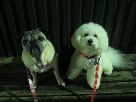 ビションフリーゼのおんなのこちゃん / PINOT、パグくん / Kotsubuと一緒に夜のおさんぽ いっぱいおさんぽしたね 楽しかったね なかよし、なかよし 記念写真もバッチリだね うれしいね ホテルおあずかり日記① http://blog.hundehutte.net/?eid=12210