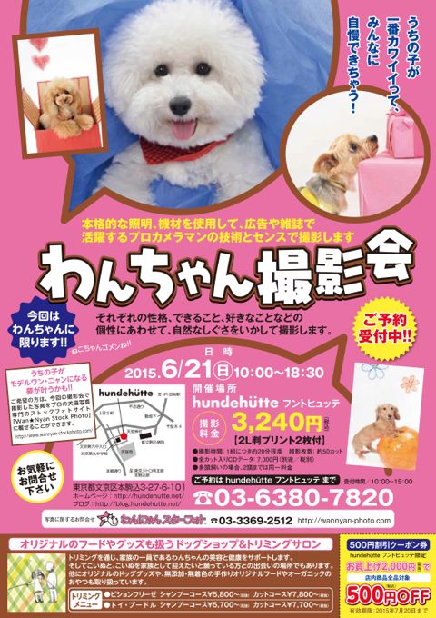 2015年6月21日(日)、当店にて写真撮影会を開催致します。 プロカメラマンによる写真撮影会です。 開店8年半にして、初のイベントです。 ひっそり、こっそりをモットーに営業しているフントヒュッテですが、ちょっと派手(?)なことをしてみようかなと。 縁があり、このような素敵な企画が立ち上がり、うれしく思います。 写真撮影会のチラシ(データ)が完成致しました。 かなり押し迫っていますが(苦笑) いろいろ無理を言ったり、そのくせ至らないことばかりで関係者の方々にご迷惑ばかりかけてしまい...