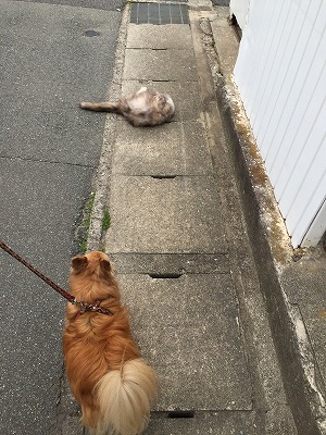 それは朝の散歩に出ようと、玄関を出た時に起こったのです。。。 何かいるよ? 兄 : 近所のボスネコじゃないかな。大丈夫だよ。 ボス : お、来たな。 ボス : (にらむ。。。) ゆうくん立ちすくみ、 目をそらしてしまいました。 兄 : よけてあげれば平気だよ。大丈夫だから。 散歩前にドキドキのゆうくんでした。 後書 : いつも朝方ウチに朝ごはんをもらいに来る近所のボスネコ、 人が来ても、車が来ても、もちろんワンちゃんがきてもよけません。 ここ...