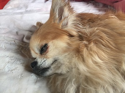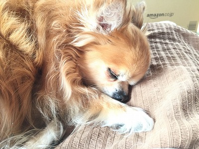 JUGEMテーマ:*チワワ* 兄さん何してるの。ベットに行こうよ。連れてってよ〜。 とりあえず膝の上〜。 眠いから先に布団に行くね。 うーん。もう寝る〜。 兄 : 起きてよ。うりゃうりゃ。 もうダメ。おやすみ。 先に寝てしまったゆうくんでした。 後書 : 小型犬は、一日に約12〜15時間くらい寝るそうです。 ゆうはシニア犬なので、睡眠時間は長めの15時間くらいです。 半目になって寝ているときがあって、ちょっと怖い時があります。 あと瞬膜が見えていて、...