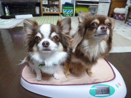 JUGEMテーマ:*チワワ* 昨日は毎月のキレイキレイの日でした フワサラになって帰ってきたワンパクたち 久々ヘルスメータの上でのツーショットです ウフッ かわいい〜〜 (超親バカ、ごめんなさいませ ) 5.98グラム・・・ その内訳は レオンく〜〜〜ん 恐る恐る・・・ ギョギョ! な、なんと 3.15kg う〜〜〜ん ちょっくら重いぞ・・・ 久しぶりに会ったお友だちに 大きくなったなぁって言われちゃったらしいです チョコちゃ〜〜〜ん ...