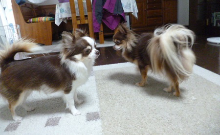JUGEMテーマ:*チワワ* ここ数日のワンパクたち、です お付き合いいただければ嬉しいです バトル まずはにらみ合い そしてレオンの抑え込み チョコは反撃の蹴り 本気なのか、遊んでいるのか・・・ 楽しんでいるのかなぁ だ〜〜い好き ヨーグルトがだ〜〜い好きなレオン 少しだけおすそ分け 立ったままペロリンしちゃうもんね ご馳走様でした〜〜〜 おも...