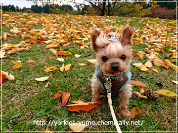 JUGEMテーマ:ヨークシャテリア ユメ:今日も公園でおサンポしました。 何度も遊びに来ている天グリです。 こちらの街に引っ越してきたので ユメちゃんのお庭にしようっと。(笑) 落ち葉がたくさん。 道を転がる枯れ葉のカサカサ音に怖がるユメちゃん。 そうするとユメちゃんに向かって転がってきて ユメちゃんが枯れ葉をよけて歩いてました。(笑) そしてこの落ち葉の多さ! 枯れ葉が道を隠していて通れません。 遠回りし...