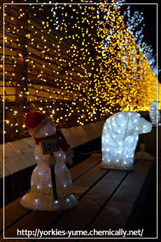 JUGEMテーマ:ヨークシャテリア なかいちウィンターパーク 今年初めてイルミネーションを見に行ってきました。 サンタさん。 奥にユメちゃんがいますよ。 これはパンダさん。 ユメちゃん、お座りするも少しお尻が浮いています。(笑) うさぎさん。 ユメちゃんは寒くてブルブルです。 雪だるまさん。 大きなツリーもありました。 いい感じにお顔が照らされています。 雪がと...