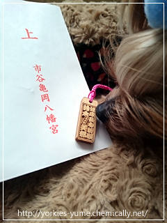 JUGEMテーマ:ヨークシャテリア ユメ:すんすんすん。 木彫りのお守り! いい香り〜♪ リヨンちゃんのママさんが 全身麻酔の治療に備えて リヨンちゃんとユメちゃんに お揃いのお守りを買ってくれたよ〜♪ こちらには神社の名称。 そしてその裏!え〜! しーさんとユメちゃんの名前が彫ってあるよ〜。 しかも「ユメ号」 なんか強そう!(笑) なぜか姉妹でこの時期に揃って全身麻酔をすることに。 リヨンちゃんはMRI検査。 ユメちゃんは後肢腫瘤摘出手術。 リヨンちゃんのママさんは ...