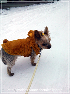 JUGEMテーマ:ヨークシャテリア 今日はりょーちんの床屋さんについてきました。 りょーちんがカットしてもらっている間、 ユメちゃんは真冬のおサンポに挑戦です! この後、初めて寒空の下でウ○チしました。 寒さで震えながらも! オ○○コもできたよ〜。 すごい?(笑) ユメ:りょーちんが待ってる。 早く行こう〜。(・∀・) ただ、泥と混じった雪の上を歩くと 腹が近くてすごく汚れますね。(−_−) 足からも泥水はねてたし。 でも雪の上でも歩けたユメちゃん、偉い! 途中から雪が降ってきて...
