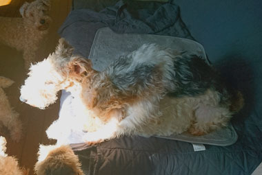朝陽が白く反射して見えにくいですが、里親募集してる7歳のジュリアンの背中で1歳になったばかりの娘のミラノ?が寝てましたw もう5.5キロくらいで重かろうにジュリアンも嫌がりもせず寝ていました。 JUGEMテーマ:ワイアーフォックステリア