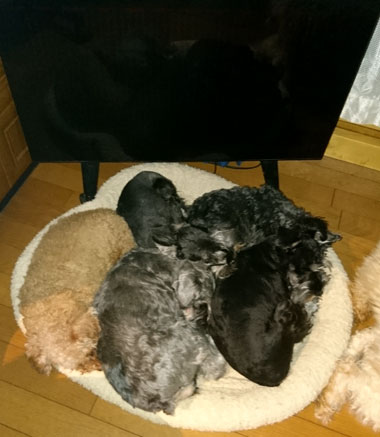 たまに来るパパが大好きな、まだ決まってないミニチュアシュナウザーの男の子2頭。 生後3か月過ぎたころからママはあまり相手にしないのに、パパはじゃれられても怒りもしないで遊んであげています。 そして、ヒーターの前でパパ、ママ、息子2人にトイプーと仲良く寝てました。 パパは息子に枕にされても起こりません。 ワイヤーやレイキーのパパでは考えられない光景ですw JUGEMテーマ:ワイアーフォックステリア